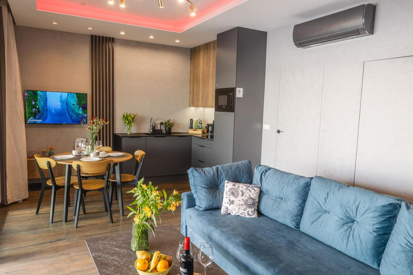 Apartament z 1 sypialnią. This apartment comprises 1 living room, 1 separate bedroom and 1 bathroom with a shower and free toiletries. Meals can be prepared in the well-fitted kitchen, which comes with a stovetop, a refrigerator, a dishwasher and kitchenware. Featuring a terrace with lake views, this apartment also provides air conditioning and a flat-screen TV with streaming services. The unit offers 2 beds. Apartament - 4 osobowy. Powierzchnia pokoju ok.: 42 mkw.
