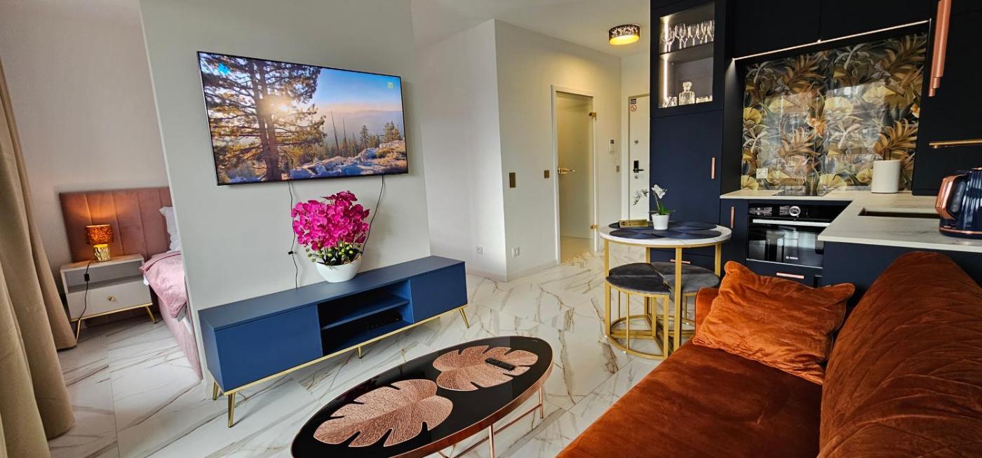 Apartament typu Deluxe z 1 sypialnią. Boasting a private entrance, this apartment features 1 living room, 1 separate bedroom and 1 bathroom with a walk-in shower and a hairdryer. In the fully equipped kitchen, guests will find a stovetop, a refrigerator, a dishwasher and kitchenware. Featuring a terrace with city views, this apartment also features a washing machine and a flat-screen TV with streaming services. The unit has 1 bed. Apartament - 2 osobowy. Powierzchnia pokoju ok.: 35 mkw.
