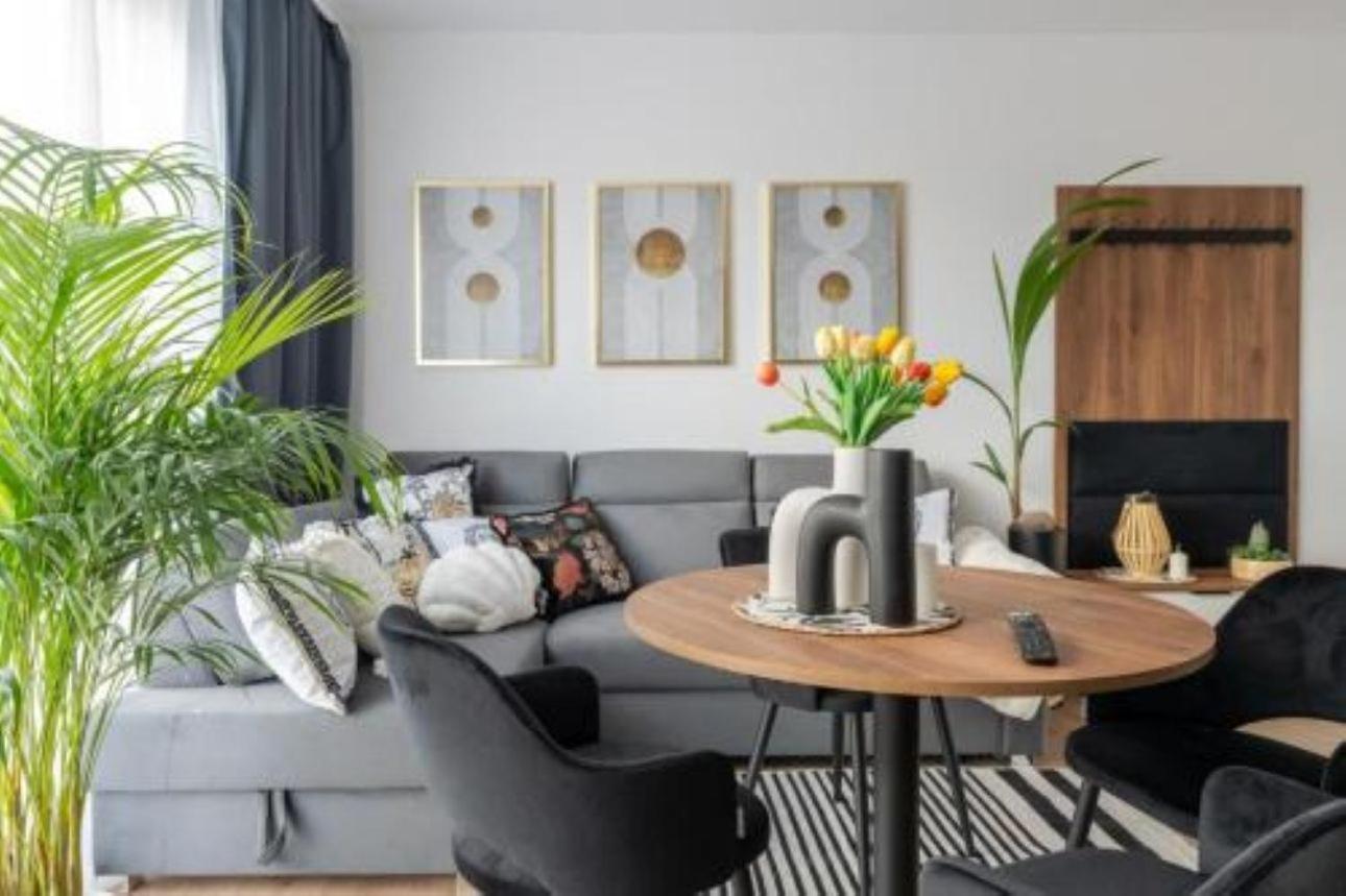 Apartament typu Deluxe z 1 sypialnią. Featuring a private entrance, this apartment comprises 1 living room, 1 separate bedroom and 1 bathroom with a shower and a hairdryer. Meals can be prepared in the well-fitted kitchenette, which comes with a stovetop, a refrigerator, a dishwasher and kitchenware. Boasting a balcony with garden views, this apartment also provides a tea and coffee maker and a flat-screen TV with streaming services. The unit offers 2 beds. Apartament - 4 osobowy. Powierzchnia pokoju ok.: 43 mkw. ;